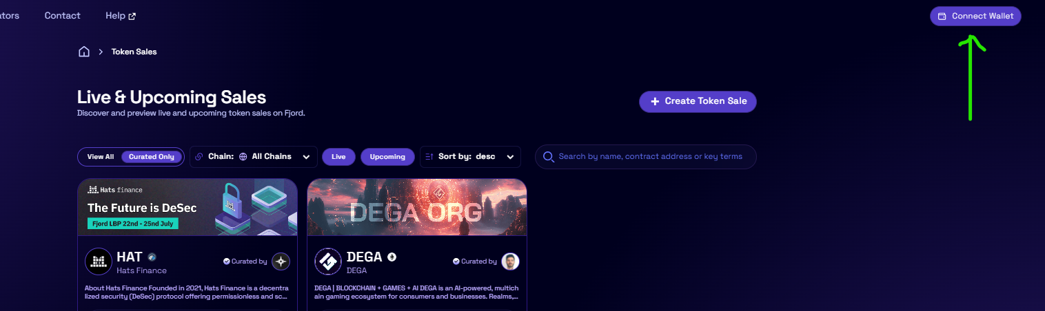 Now you have your funding tokens in your wallet, you can visit the [Fjord foundry](https://www.fjordfoundry.com/) website, and connect your wallet. Click the “Connect Wallet” button in the top right hand of the screen and choose your wallet.